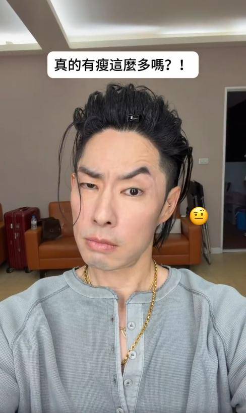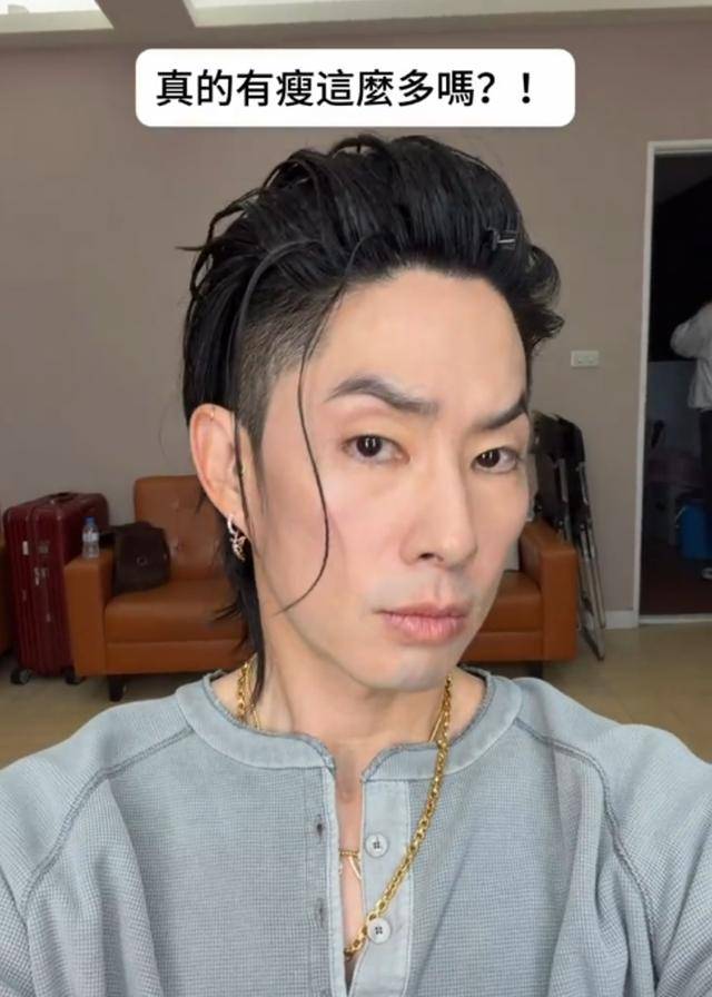 只见他留着长发,穿件灰色圆领衫,还戴着金链子,他盯着镜头,一脸诧异地问:“真的有瘦这么多吗?”