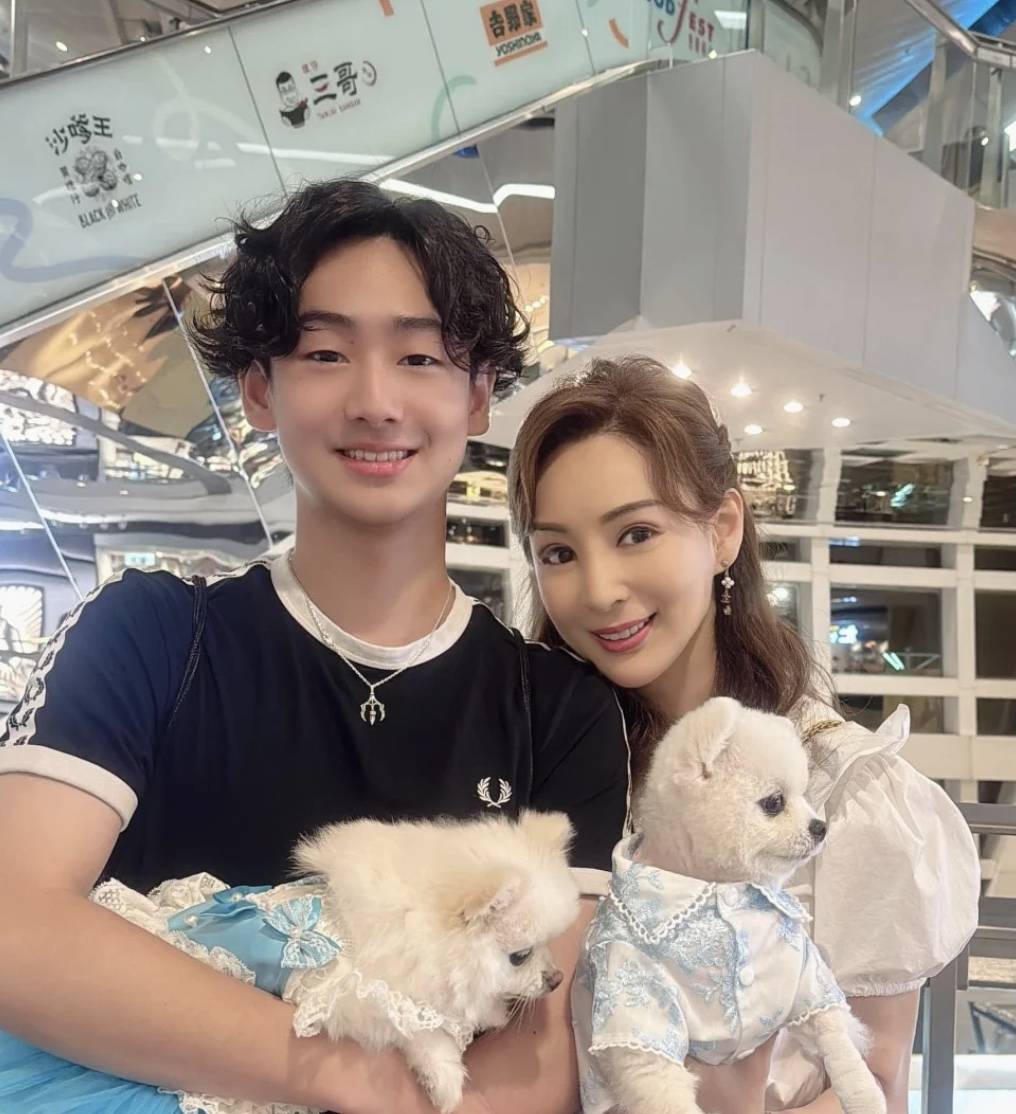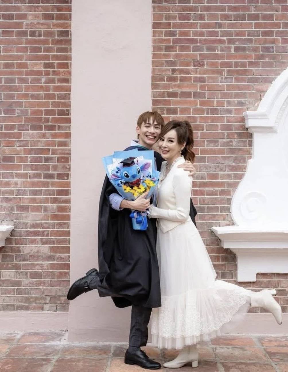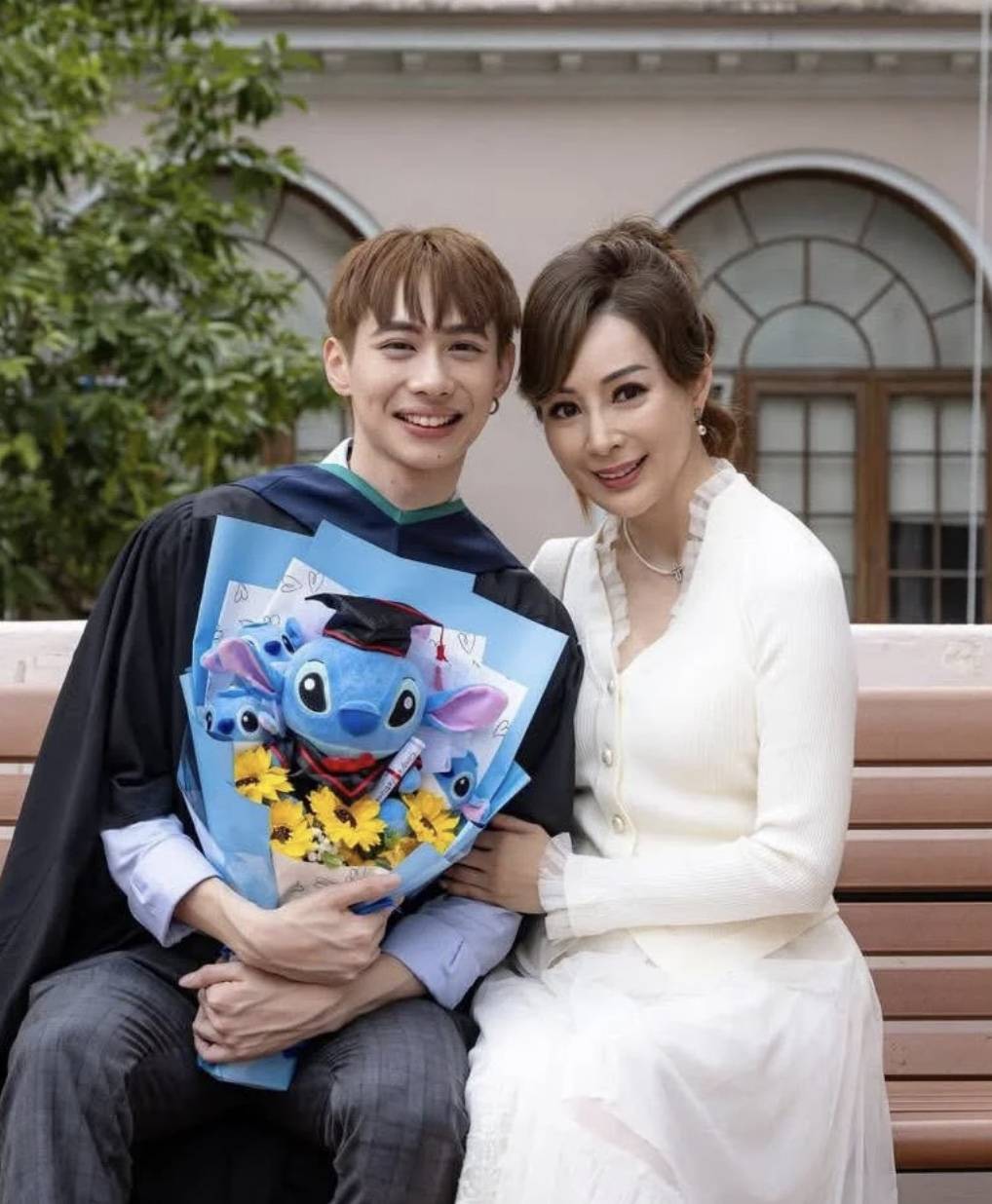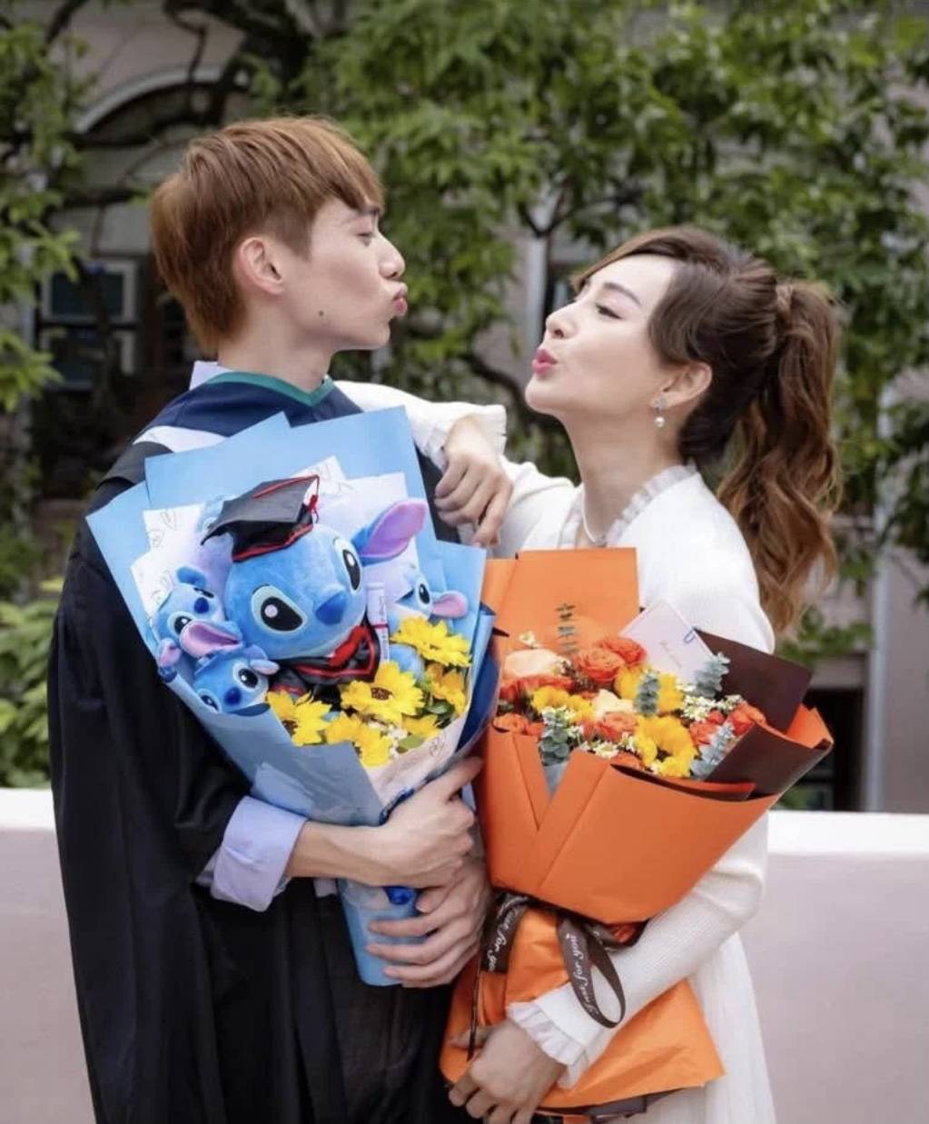 而罗霖身旁的大儿子则是穿着毕业袍,手捧一束鲜花,他的身高已经明显超过母亲,染了一头金色的头发,脸型看起来和罗霖极为相似,想来也是继承了母亲的高颜值。