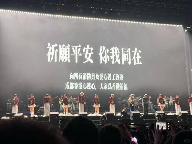 演唱会上巨大的背景屏幕一片纯黑,上面缓缓浮现出一行白色大字:“祈愿平安,你我同在”。