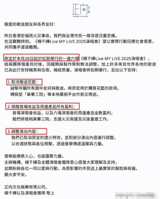杨千嬅在本次火灾后捐出复出演唱会的全部收益,但她并未大肆宣传这一决定。