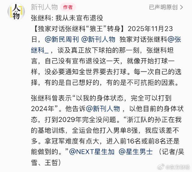 据东方财经,12月3日,账号“新刊人物”发布了一则“独家对话张继科”的访谈视频。视频中,张继科表示:“我也没有说是非要宣布退役或者干嘛的,没有这一
