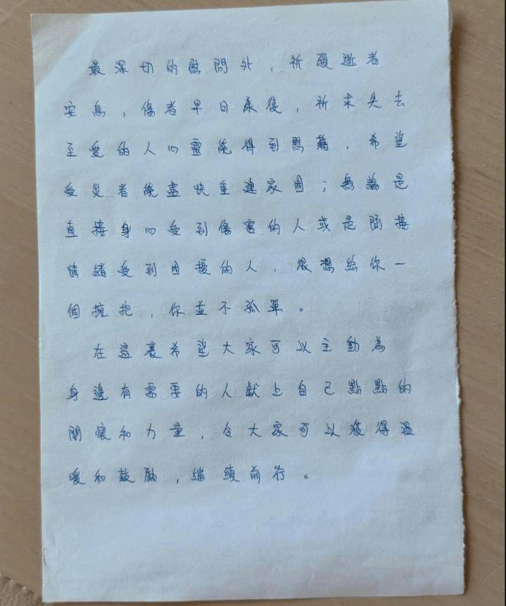 炎明熹今日发布一封手写信,她坦言想了很久不知能做些什么,但很想为身心受到伤害的人或是间接情绪受到困扰的人送上拥抱,也希望大家能多关心身边人。