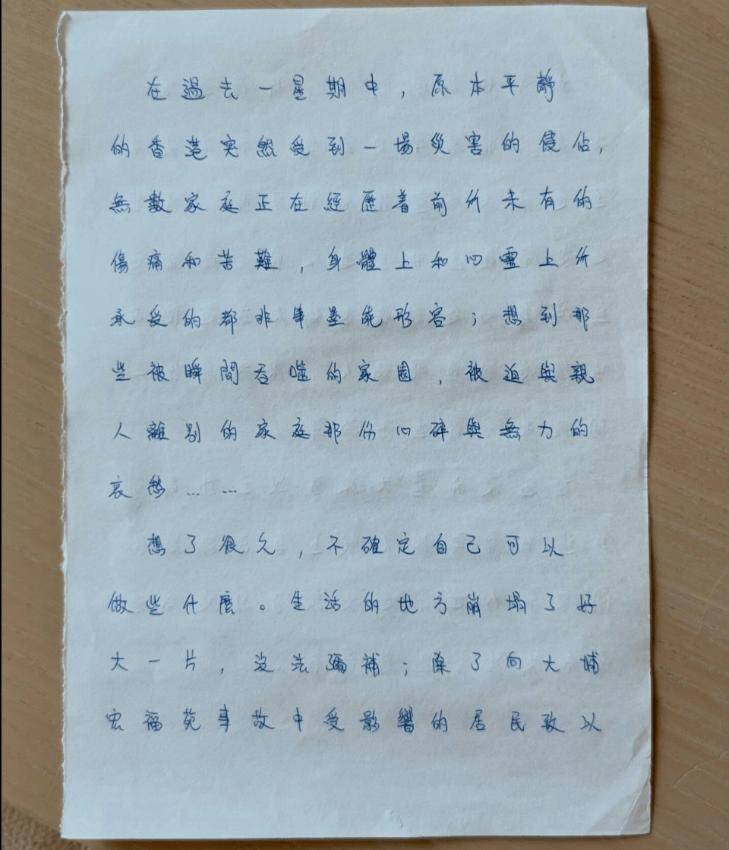 在过去一星期中,原本平静的香港突然受到一场灾害的侵占,无数家庭正在经历着前所未有的伤痛和苦难,身体上和心灵上所承受的都非笔墨能形容;想到那些被瞬间吞噬的家园,被迫与亲人离别的家庭那份心碎与无力的哀愁……