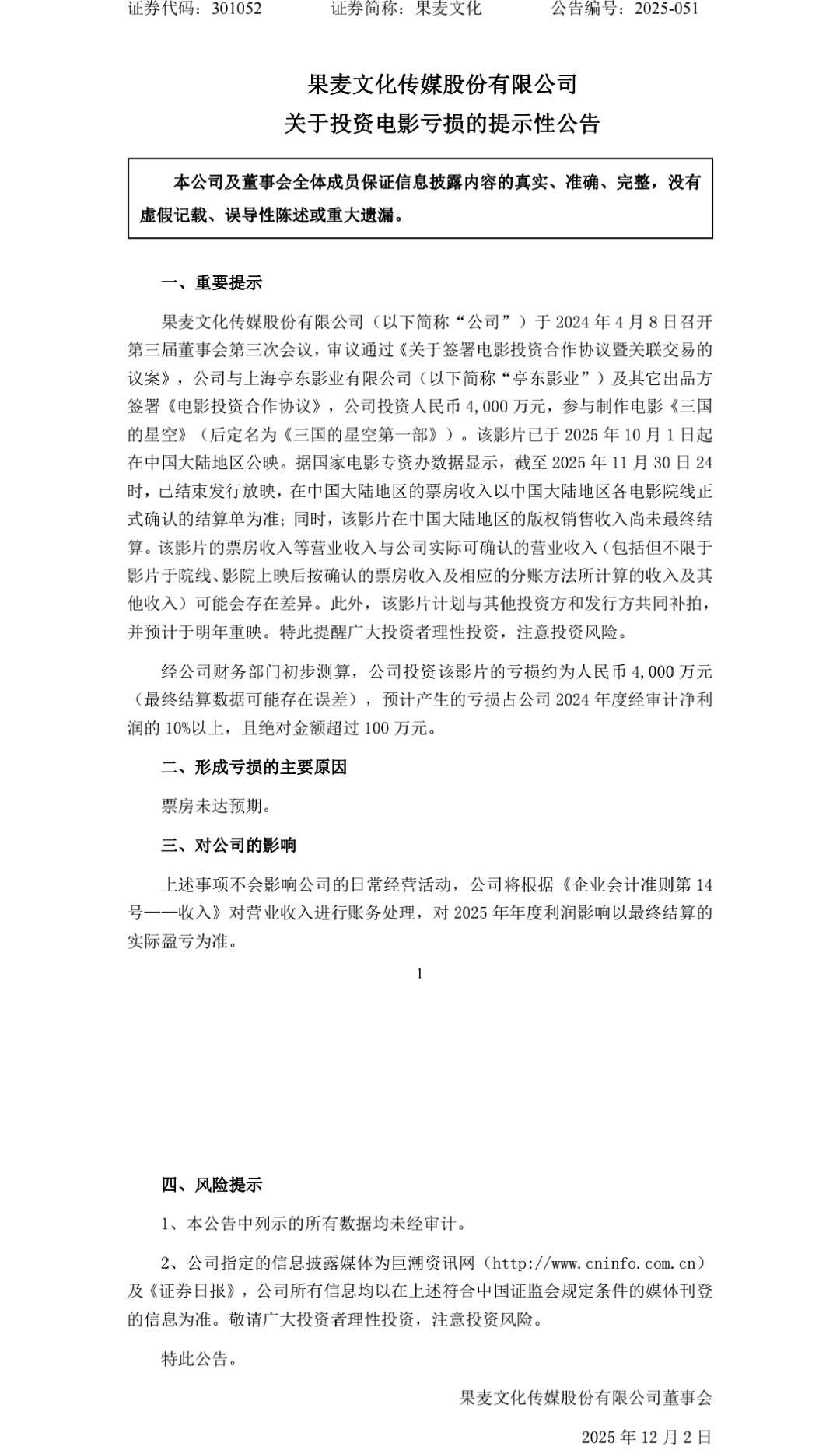 12月2日,上市公司果麦文化公告,公司投资4000万元参与制作动画电影《三国的星空第一部》,经财部门初步测算,公司投资该影片的亏损约为4000万元(最终结算数据可能存在误差)。