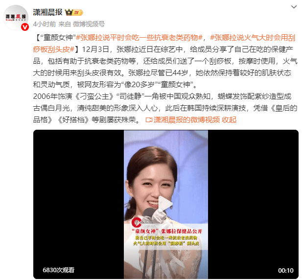 近日,张娜拉在综艺中,给成员分享了自己在吃的保健产品,包括有助于抗衰老类药物等,还给成员们送了一个刮痧板,按摩时使用,火气大的时候用来刮头皮很有效。张娜拉尽管已44岁,她依然保持着较好的肌肤状态和灵动气质,被网友形容为“像20多岁”“童颜女神”。