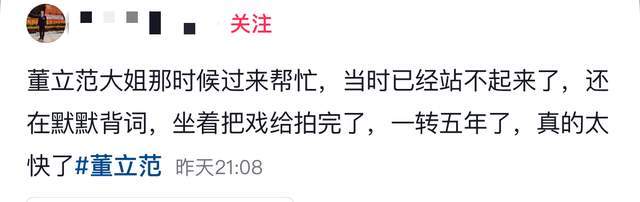 “董立范大姐那时候过来帮忙,当时已经站不起来了,还在默默背台词,坐着把戏给拍完了,一转五年了,真的太快了。”
