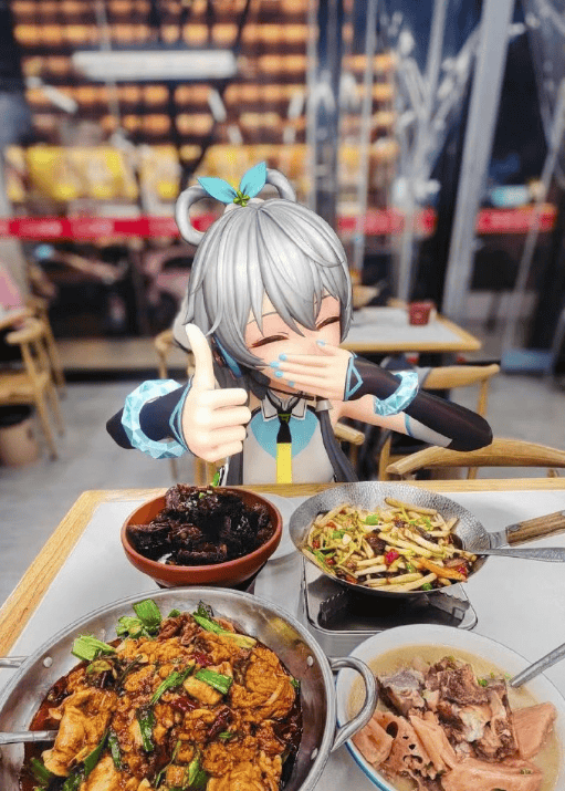 画面中她被辣到捂嘴跳脚、疯狂吸入解辣汤品(排骨藕汤、蛋酒),却坚持竖大拇指点赞。这种虚拟角色展现人类吃辣的真实窘态,形成强烈反差萌,引发病毒式传播。