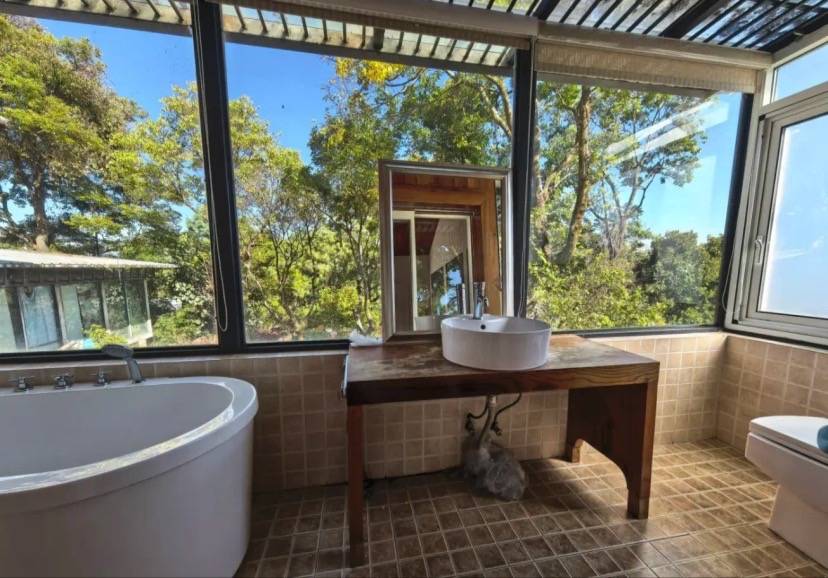 房子做了玻璃顶,可以看到蓝蓝的天空、外面是郁郁葱葱的树木,住在这里心旷神怡。卫生间的位置安装了大浴缸、边泡澡边欣赏美景。