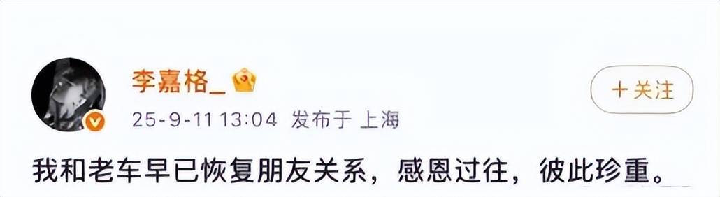 2025年9月11日,在车澈被曝街头拥抱女演员乃万后,李嘉格发文官宣早已离婚,以“感恩过往,彼此珍重”为七年婚姻画上句号,并约定以朋友身份共同抚养孩子。这场婚姻,如她所言,冷暖自知。