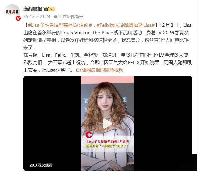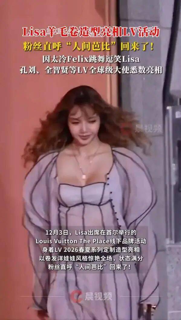 12月3日,路易威登在首尔举办的The Place品牌活动,因为一个人的亮相彻底点燃了社交媒体——BLACKPINK成员Lisa以一身2026春夏系列定制造型登场,标志性的“人间芭比”形象强势回归,瞬间霸占热搜。