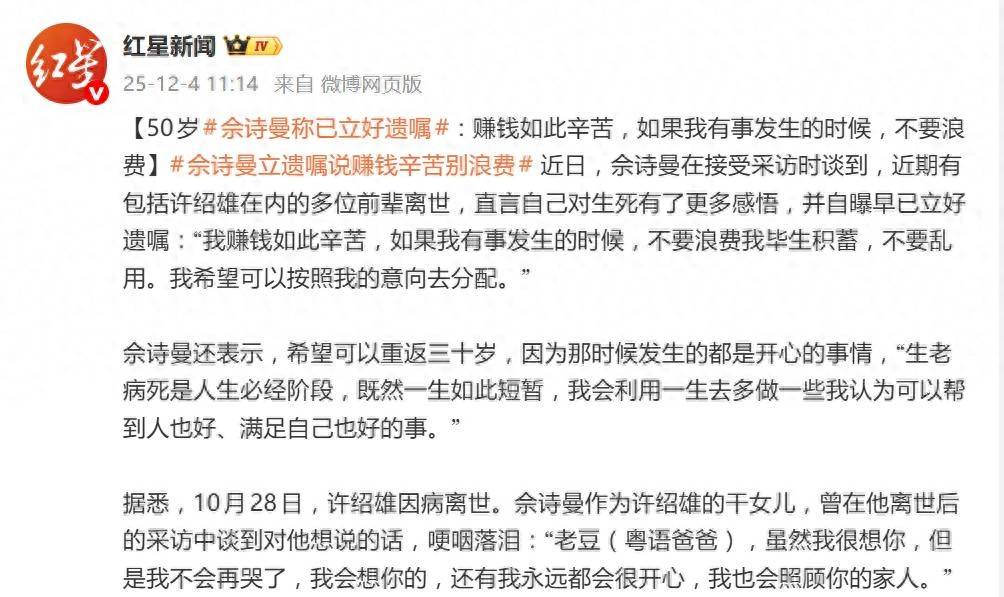 据12月4日报道,当50岁的佘诗曼在镜头前,用聊家常般的语气说出“我早就立好遗嘱了”,这句话的冲击力,不亚于她在宫斗剧里扔下一枚重磅炸弹。没有悲情,只有清醒——“我赚钱如此辛苦,如果我有事发生的时候,不要浪费我毕生积蓄,不要乱用。”
