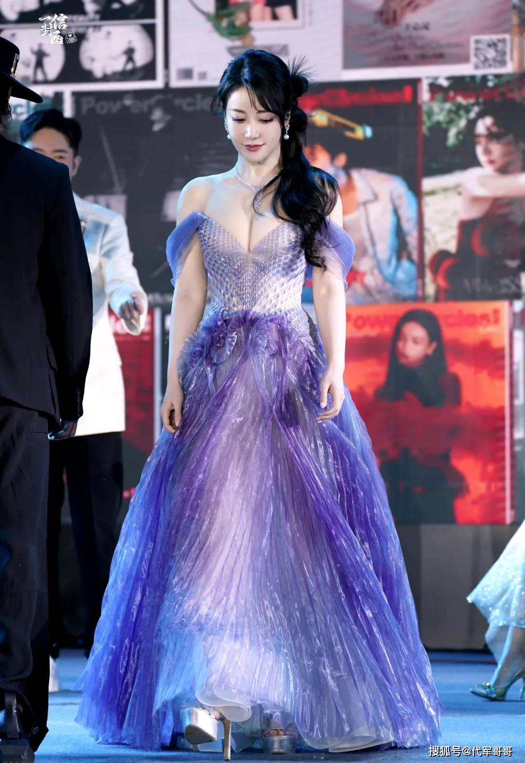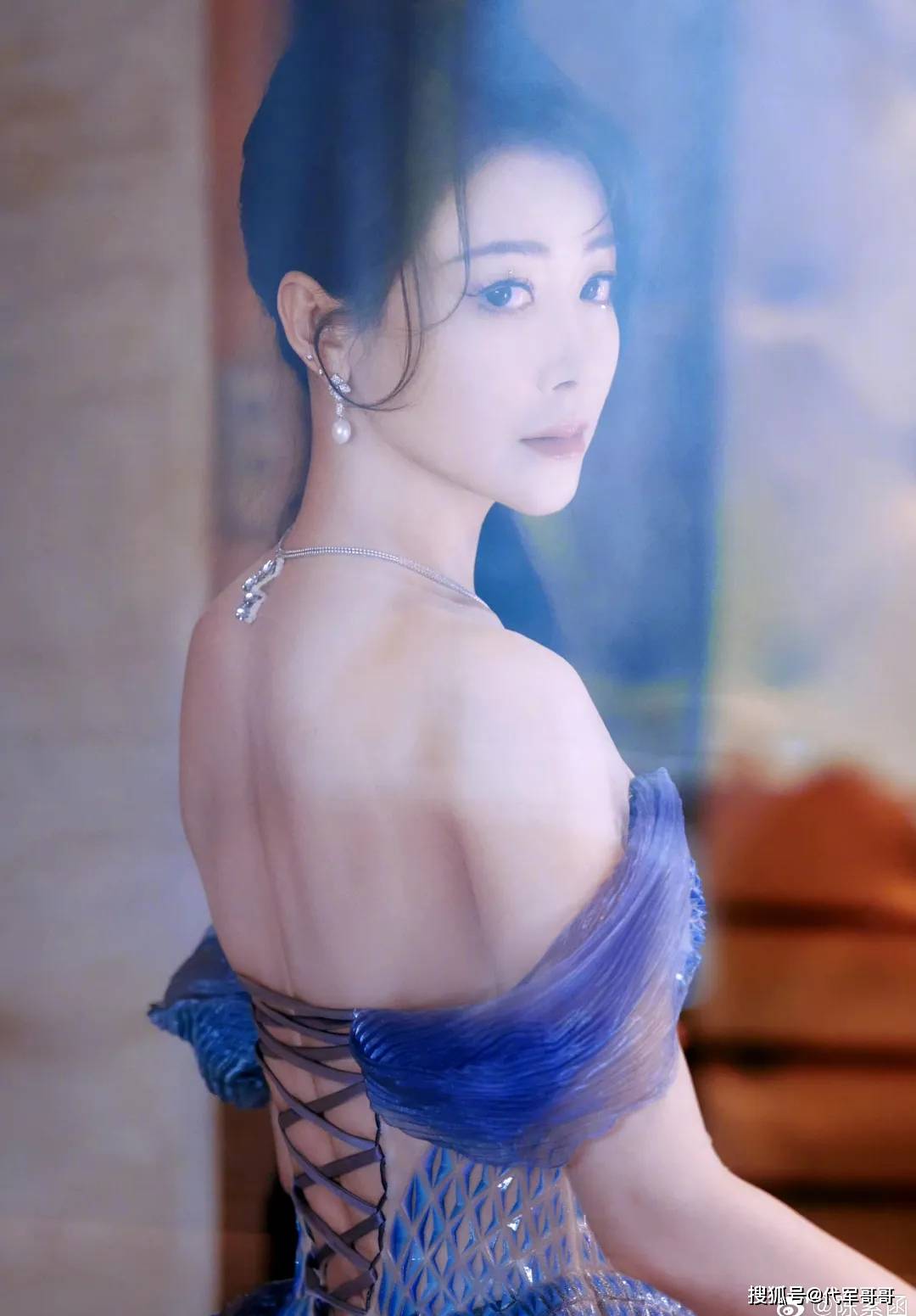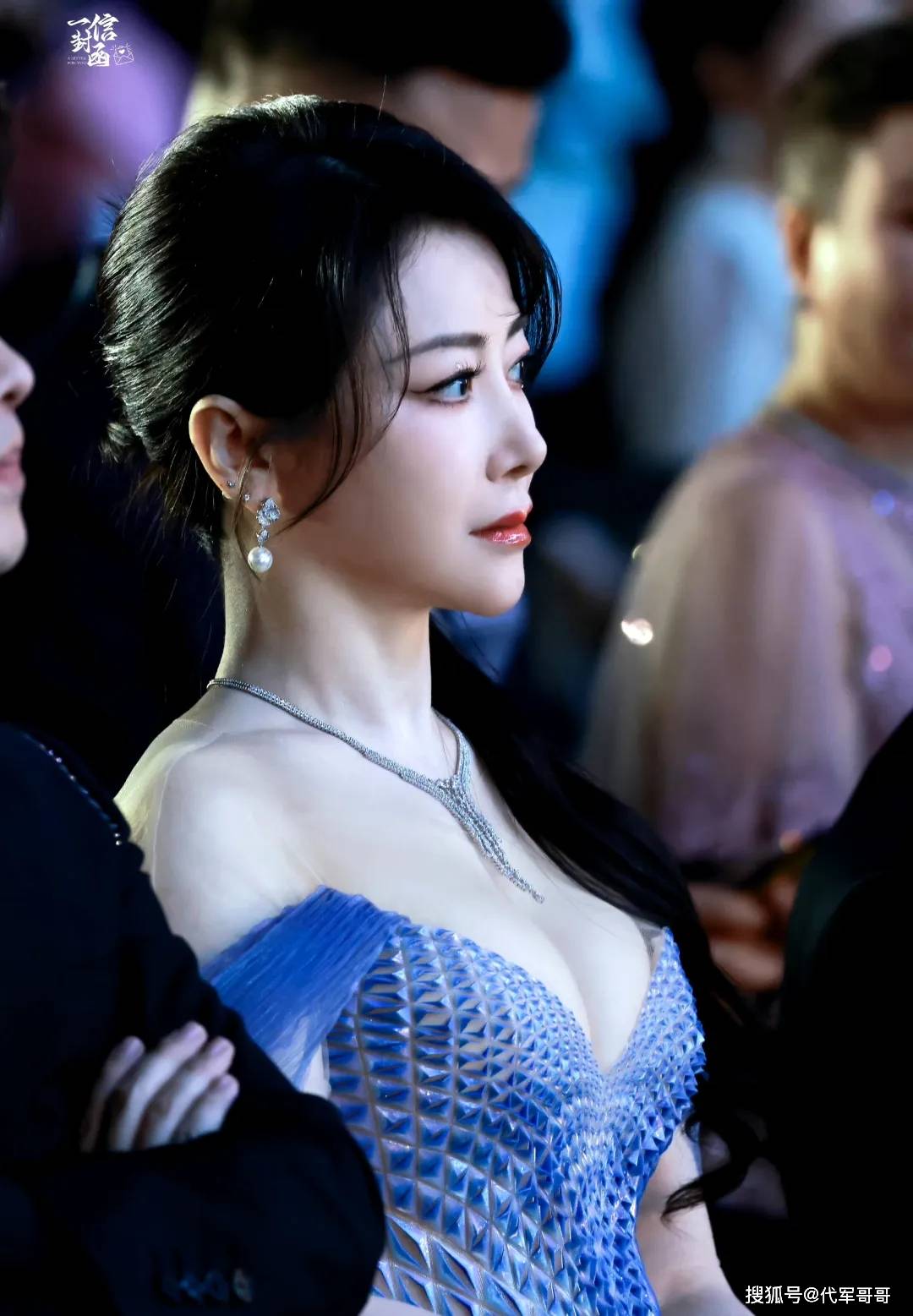 抹胸的设计是这件礼服的点睛之笔,大方展露陈紫函白皙紧致的肩颈线条,没有一丝松弛感,仿佛岁月从未在她身上留下痕迹。那线条流畅优美,延伸至天鹅颈,衬托出她精致的锁骨,宛如古希腊雕塑般完美。搭配上简约的钻石项链,在灯光下闪烁着细碎光芒,更添几分高贵典雅。