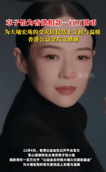 4日,香港公益金在公开平台发文,衷心感谢知名女演员章子怡小姐捐款港币一百万元予“公益金及时雨大埔火灾援助基金”,为大埔宏苑的受灾居民送上支援与温暖。