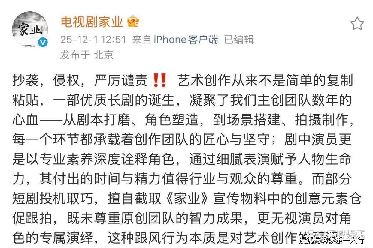 正剧未播,山寨已赚走流量? 一部投资3.2亿、筹备近一年的长剧还没播出,就被成本不足50万的短剧“像素级抄袭”了。 这不是段子,而是2025年底影视圈最魔幻的现实,杨紫、韩东君主演的《家业》正遭遇一场“剧未播,盗版先火”的荒诞闹剧。