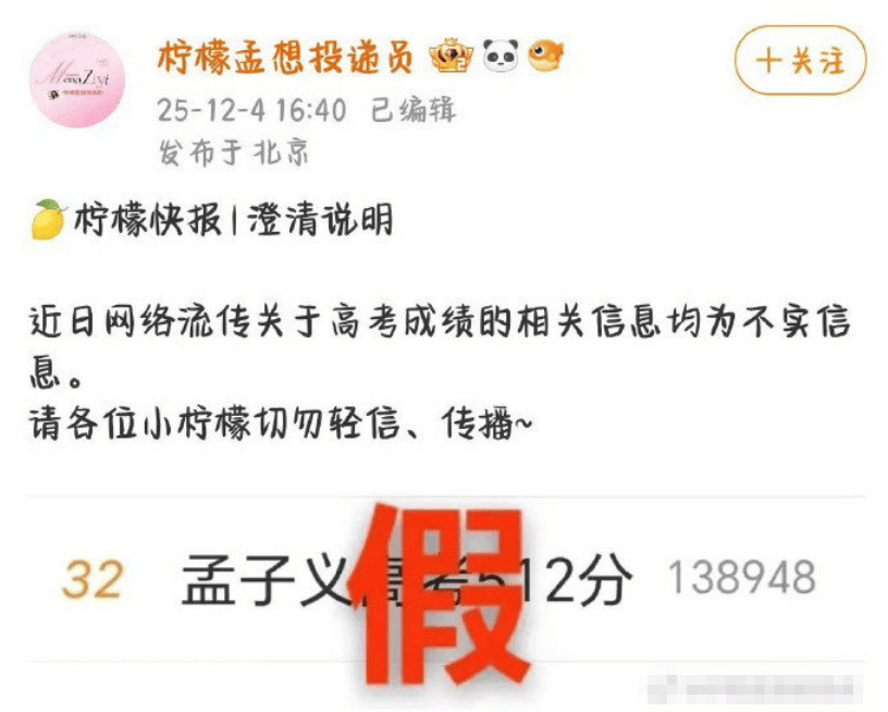 近日,网传孟子义高考成绩有512分引发热议。4日,孟子义方发声辟谣道:“近日网络流传关于高考成绩的相关信息均为不实信息。请各位小柠檬切勿轻信、传播。”
