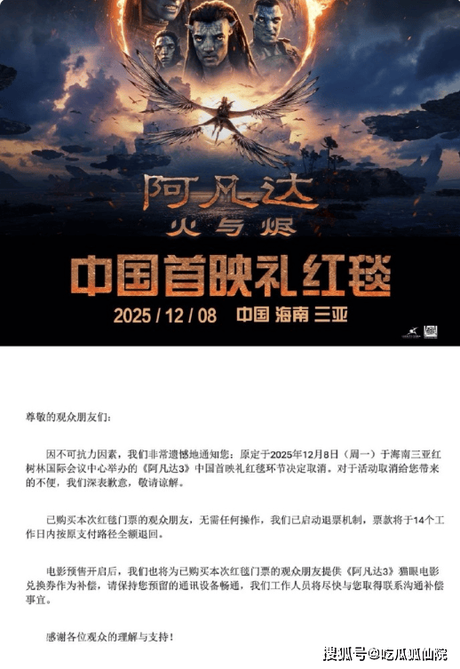 近日,《阿凡达3》官方发布一则致歉声明,原定于12月8日在三亚举行的首映礼红毯环节,因不可抗力因素被迫取消,这一消息让众多翘首以盼的影迷们倍感遗憾。