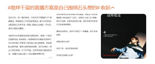 不过,采访中也有一个超可爱的小细节,温暖了无数人的心。原来当时微博直播叠石头,并非简单随意为之。千玺围绕石头想出了很多版本的方案,一心只想把自己的爱好分享给大家。他就像一个安静内敛的小孩,默默用自己的方式与粉丝互动,传递着热爱与真诚。这种对生活细节的用心,以及渴望与粉丝分享美好的心意,让我们看到了舞台下真实又亲切的易烊千玺。