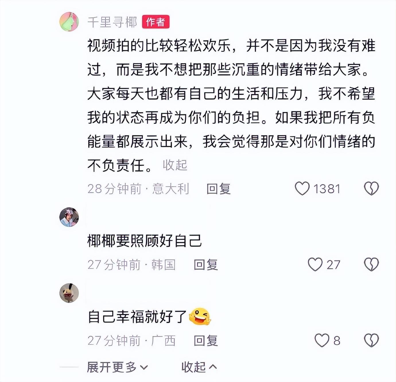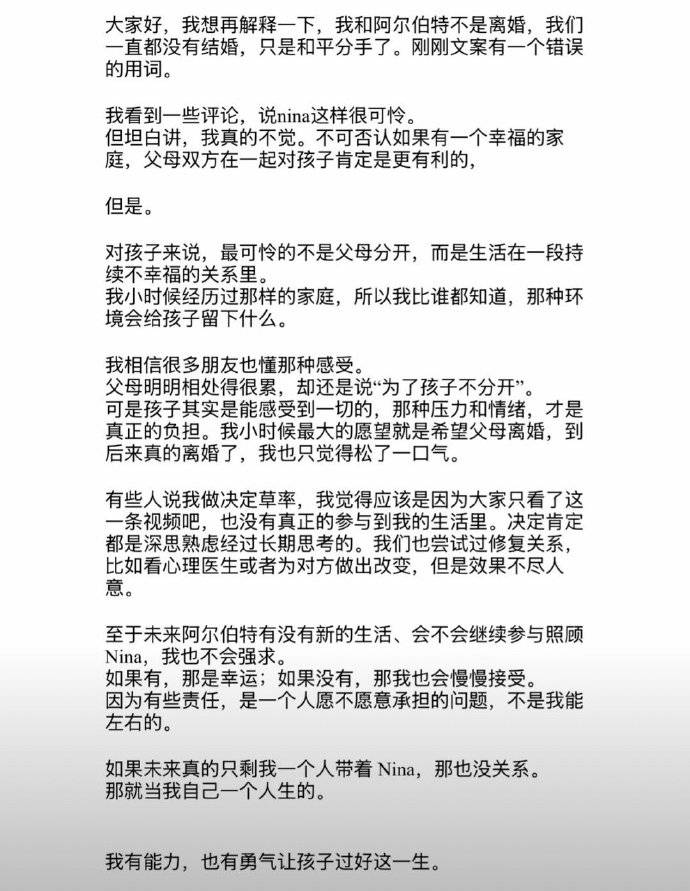 比起关系的终结方式,千里寻椰在声明中提出的核心观点更引发深思。基于自身童年经历,她旗帜鲜明地提出:情绪健康优先于形式完整。“最可怕的不是父母分开,而是孩子生活在持续不幸福的关系中。”她拒绝让女儿内化父母的情感阴影,认为压抑的家庭环境会造成更深伤害,并直接反驳了“为了孩子不分开”的传统叙事。