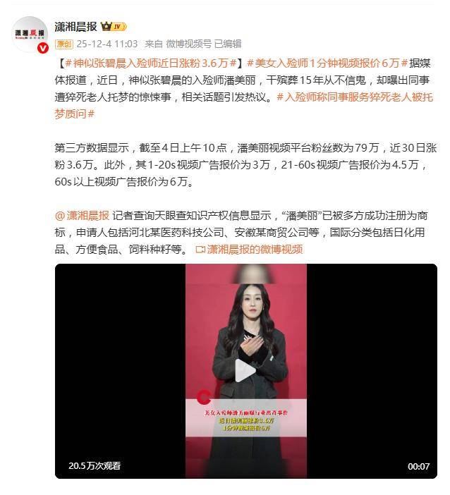 从灵异故事到职业信念,从外貌反差到商业变现,潘美丽的走红是一场多棱镜式的围观。它照见的,既是流量时代特质与职业碰撞出的奇异火花,更是社会对死亡态度悄然转变的缩影——我们开始愿意平静地讨论,谁在为我们所爱的人,守护这最后一程的体面。