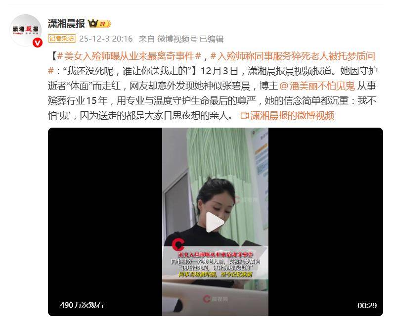 据12月4日报道,当一位长相酷似歌手张碧晨的入殓师,在网络上讲述同事遭遇逝者“托梦质问”的离奇经历时,这场关于生死的讨论瞬间引爆了热搜。人们关注的焦点,也从最初