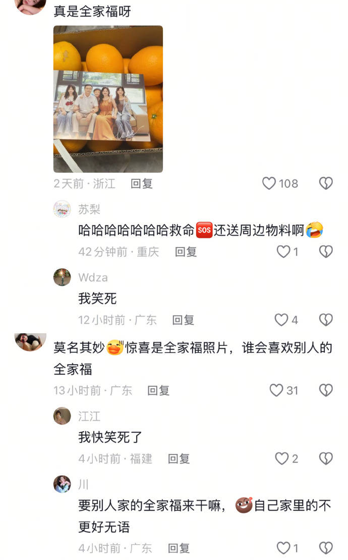 乍一看,送全家福似乎是想强化其“家庭温情”的人设,试图用“将粉丝视作家人”的情怀拉近距离。少数支持者也认为这是“暖心举动”。但这套“情感牌”在多数消费者面前彻底失灵了。大家用脚投票,列举出一系列更实在的替代方案:橙子开口器、额外水果、试吃小零食……任何一样都比一张陌生人的合影来得实用。尤其照片中儿子被置于C位,还遭到了额外吐槽,被比喻为“公司年会抽到老板签名照般的无力与尴尬”。