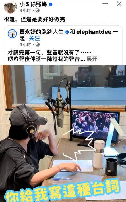 4日,小S在社交平台上发文回应录跨年宣传片崩溃大哭,她表示:“很难,但还是要好好做完。”