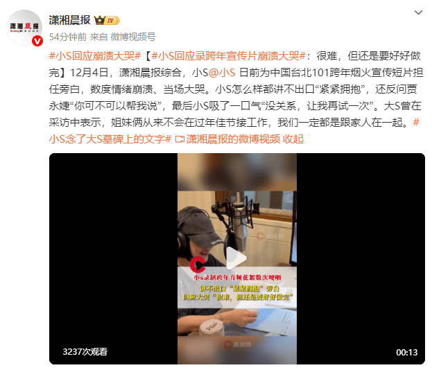 12月4日,潇湘晨报综合,小S日前为中国台北101跨年烟火宣传短片担任旁白,数度情绪崩溃、当场大哭。小S怎么样都讲不出口“紧紧拥抱”,还反问贾永婕“你可不可以帮我说”,最后小S吸了一口气“没关系,让我再试一次”。据悉,大S曾在采访中表示,姐妹俩从来不会在过年佳节接工作,“我们一定都是跟家人在一起”。