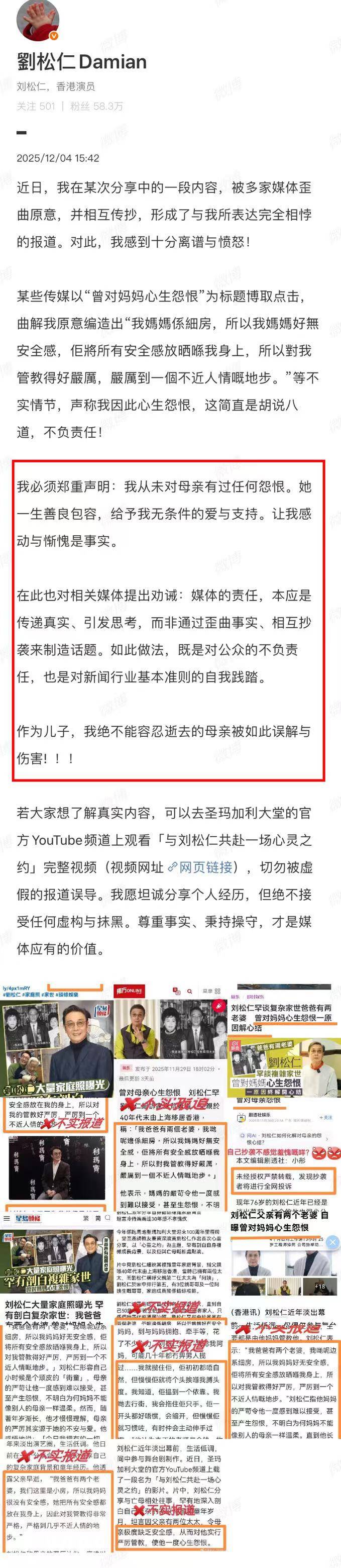 刘松仁作为艺人,被报道很多次,其中真真假假,这次发文辟谣应该是忍无可忍,出于对母亲的尊重,所以才辟谣。