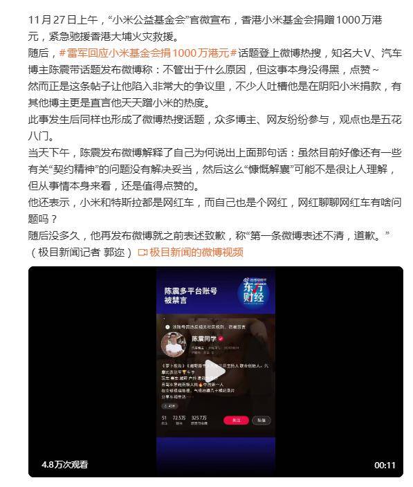 禁言的导火索,普遍被认为与一周前他卷入的一场关于小米的舆论风波有关。11月27日,在“小米公益基金会”宣布捐赠1000万港元驰援香港火灾后,#雷军回应小米基金会捐1000万港元#登上热搜。陈震随即带话题发布微博称:“不管出于什么原因,但这事本身没得黑,点赞~”