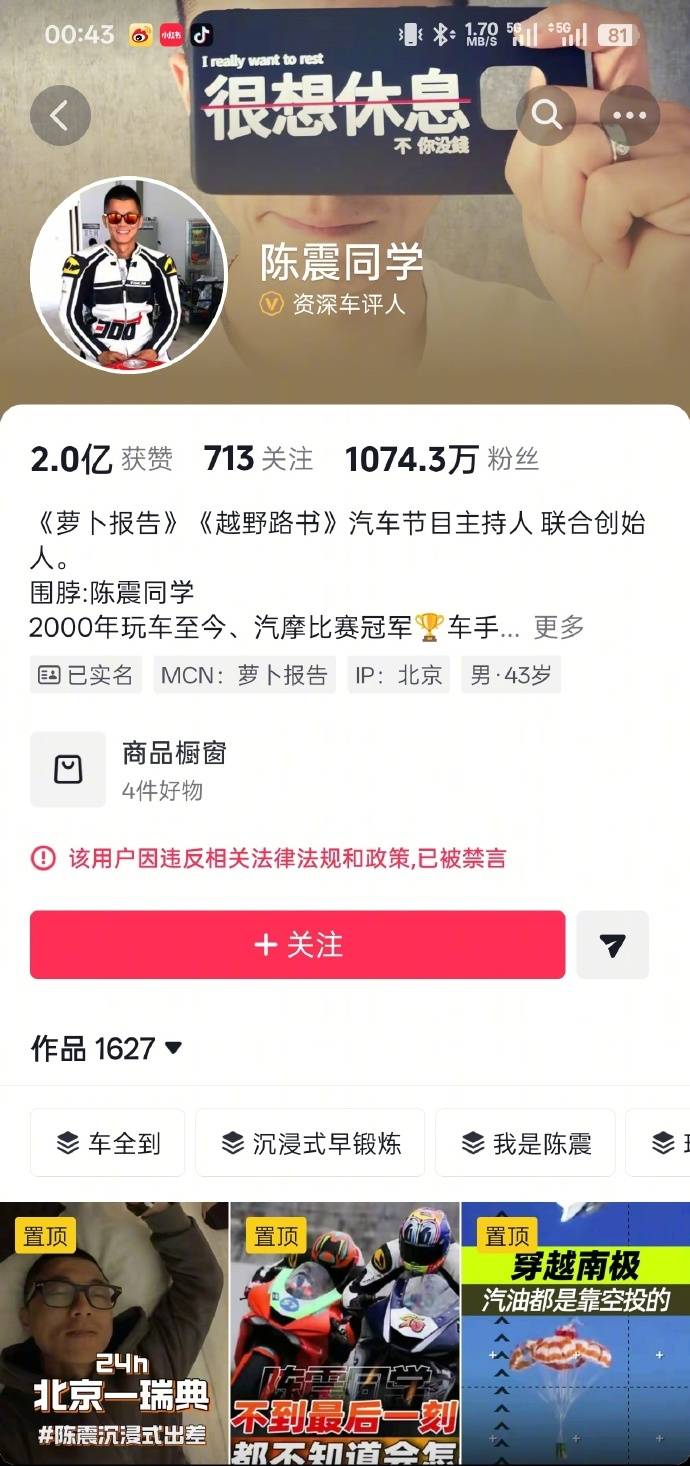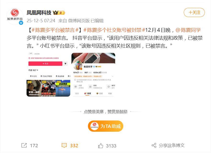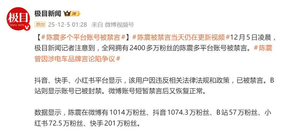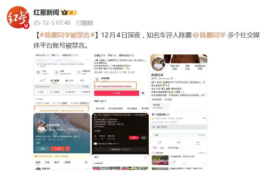 一句“网红聊聊网红车有啥问题吗”,如今看来,问题可能不小。12月4日深夜至5日凌晨,知名汽车博主“陈震同学”遭遇了一场席卷全网的“静默风暴”——其抖音、小红书、B站、快手等平台账号几乎同步被禁言或封禁。一夜之间,这位坐拥超2400万粉丝的顶流大V,在互联网上被集体“消音”。