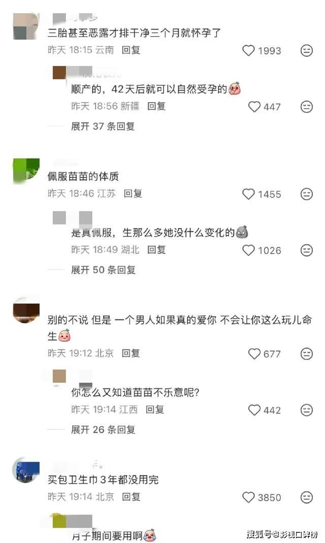 尤其是不争不抢的性格让她的处境越发尴尬,跟半退圈似的没啥存在感。成名不过三载,苗苗就选择和郑恺结婚,此后便迎来了“不间断怀孕生娃”的生活,想要复出拍戏尤其困难。截止当前为止,苗苗郑恺夫妻膝下共有一子二女。有网友指出,生产后恶露排净后仅三个月就怀孕,就意味着产妇要在身体还未完全恢复的情况下再一次承受分娩痛苦,尤其第三胎为剖腹产,对身体的损伤不言而喻。