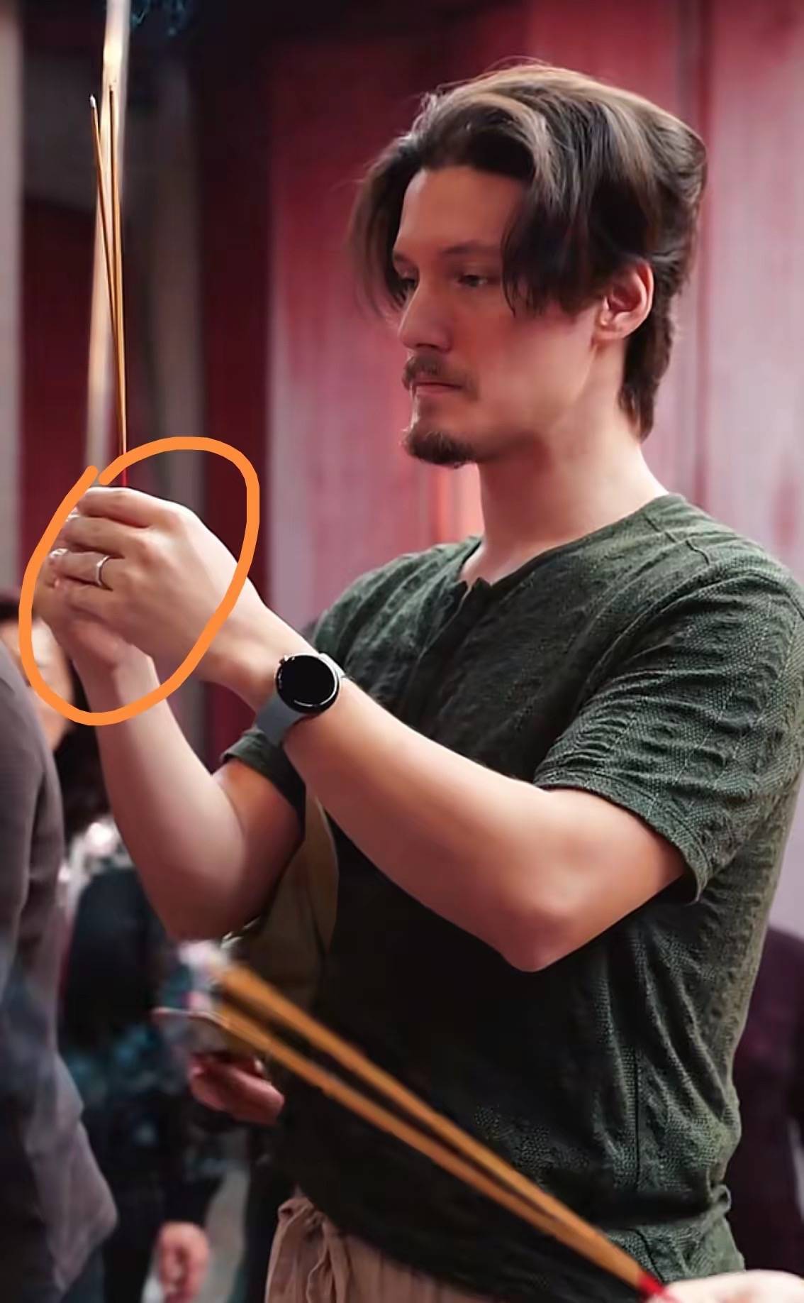 这一次周华健带着妻儿一起回乡祭祖,在周氏祠堂前合影。他表情严肃、并且尊重宗族礼仪焚香、合十祈福。