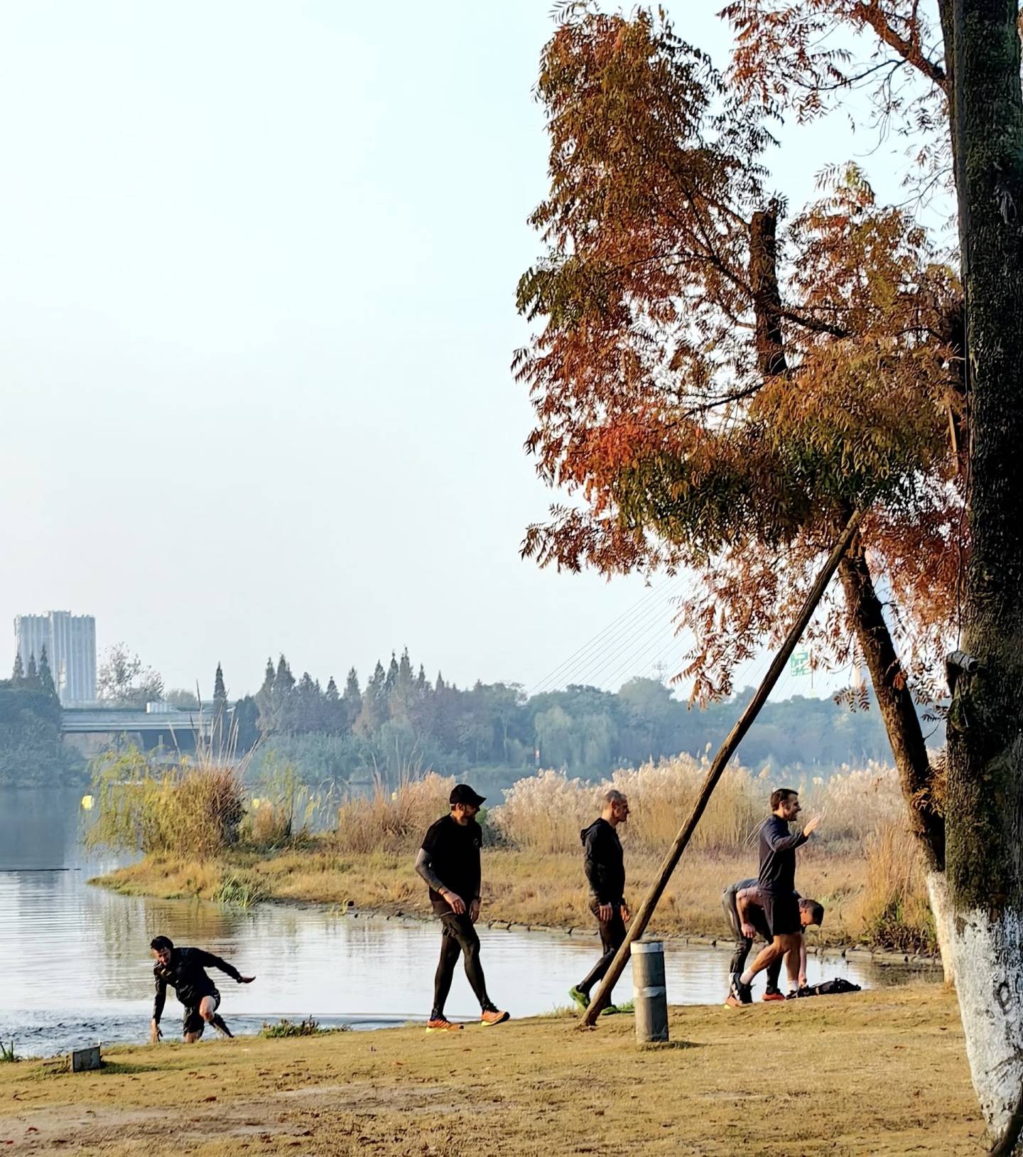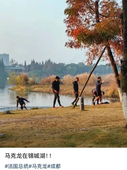 5号一大早,马克龙就在锦城湖晨跑了。这里环境不错,周边的树木还有绿色的叶子,当地天气虽然不是很冷、却也算不上暖和。