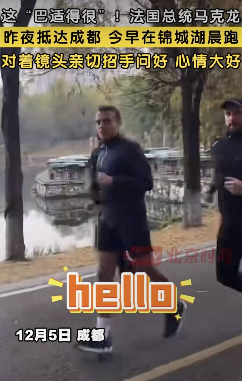 不仅不需要倒时差,还在大早上起来带着团队一起晨跑。马克龙应该是4日晚上抵达成都的,下飞机的时候穿风衣帅气保暖。