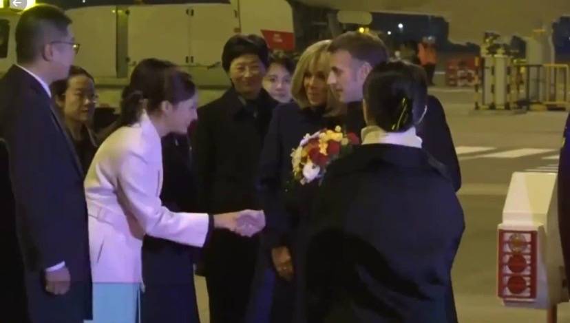 这次访华,马克龙带着72岁的老婆布里吉特。他们从专属飞机上走下来,有漂亮的小姐姐献花,也是给法总统足够的牌面。布里吉特也换了一身黑衣,看起来干练大方。