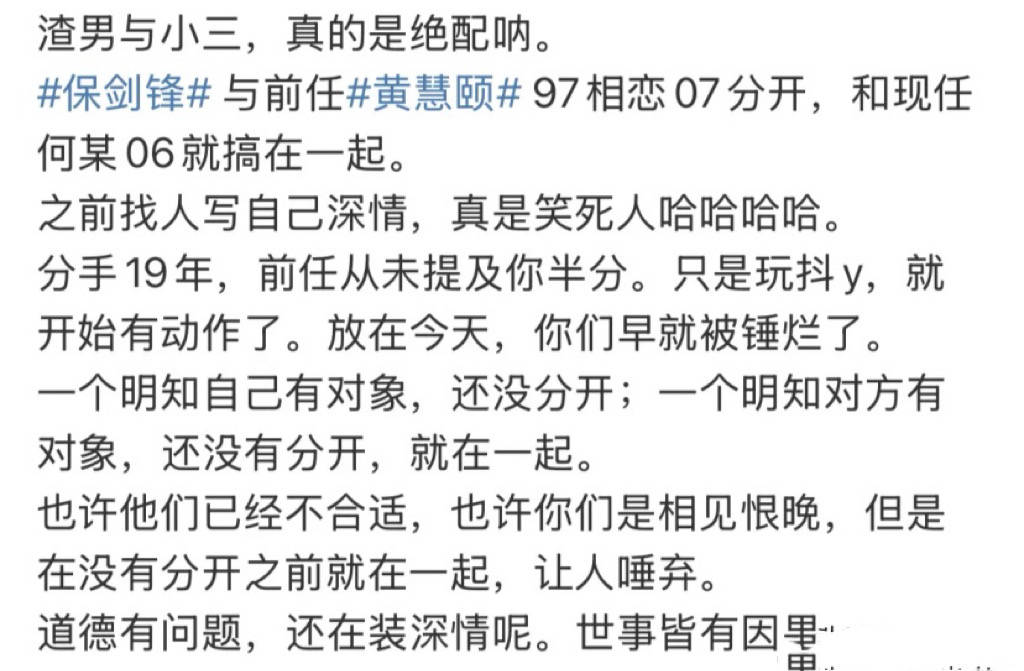 更有课代表总结了,说保剑锋和前任黄慧颐还没有分开的时候,就和现任搞在一起了。还找人写自己深情,真是笑死了。
