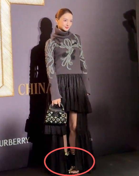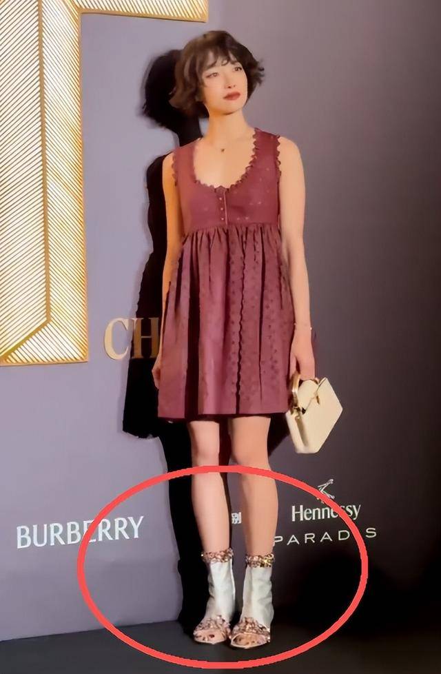 高领毛衣+小短裙,脚上还穿着一双“四不像”鞋子,说是凉鞋吧,它却长得跟长筒靴一样,可说它是靴子吧,它又露着脚指头,穿搭真是让人无法欣赏,果然明星的潮流咱们普通人不会懂。