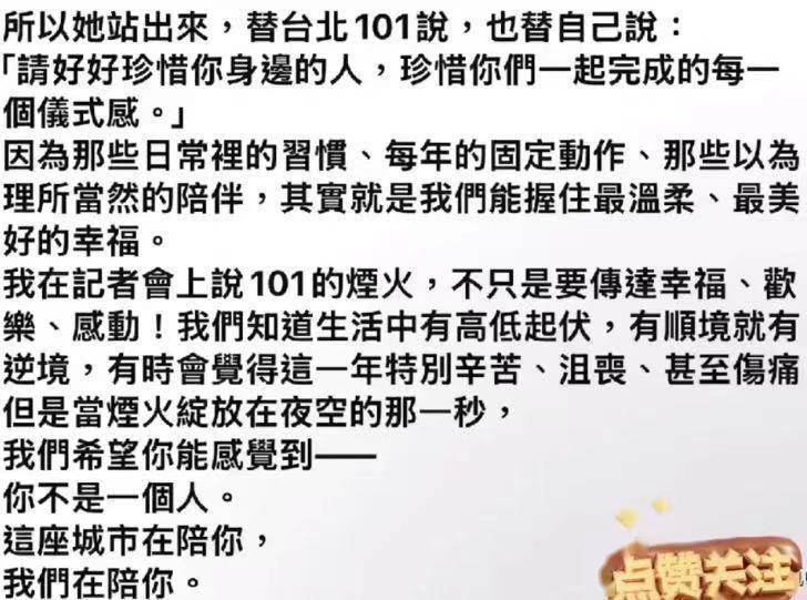 徐家有个传统,每年都要大家聚在一起跨年,而2026年跨年,也是大S缺失的一年,101大厦贾永婕邀请小S跨年录制宣传片《因为有你》,小S为视频宣传,目的是告诉大家珍惜眼前人,贾永婕透露小S哭着录完宣传片,小S还对姐姐说了一句“Remember together forever!”,这句话被大S和具俊晔纹在身上,大S的墓碑上也是这句话,意思是永远相守。