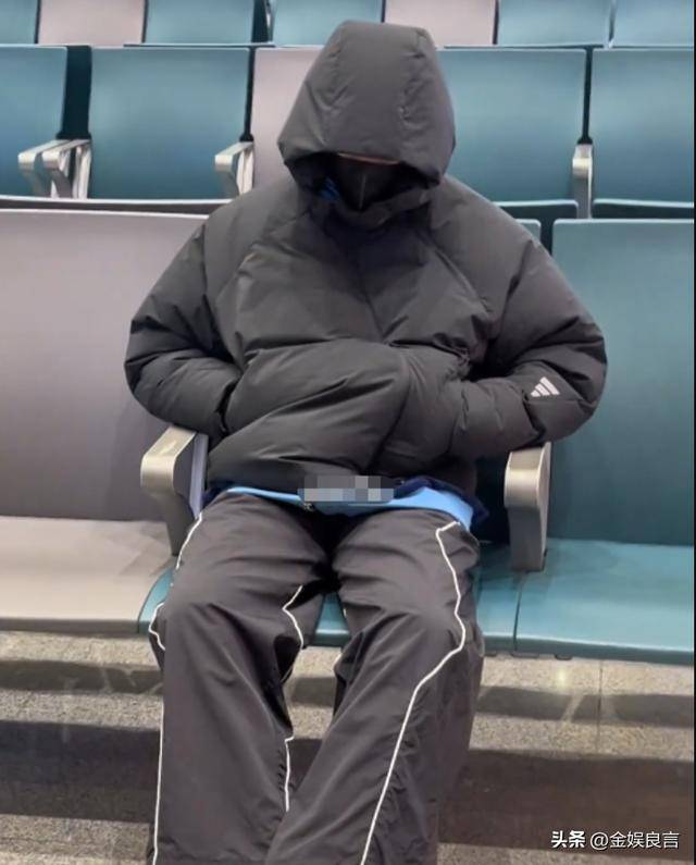 可机场里的他,却没了屏幕上的活力,他穿着灰色连帽棉袄,戴着黑色口罩,径直走到候机区的冷板凳旁坐下。