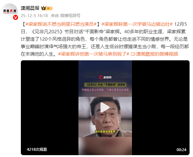 12月5日,《见非凡2025》节目对话“千面影帝”梁家辉。40多年的职业生涯,梁家辉累计塑造了120个风格迥异的角色,每个角色都曾让他走进不同的情感世界。无论是事业巅峰时演绎气场强大的帝王,还是人生低谷时摆摊谋生当小贩,每一段经历都在丰满他的人生。