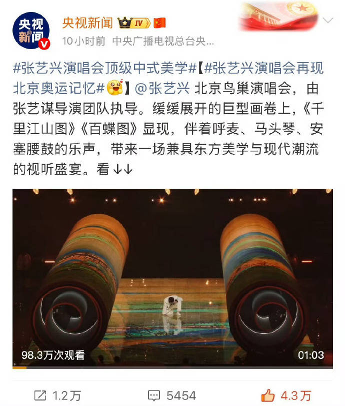 而这种影响力,并没有停留在海外。2025年,张艺兴在鸟巢举办的“美猴王闹天宫”演唱会,直接把文化输出拉到了新高度。张艺谋团队操刀,用数字技术重现《千里江山图》《百蝶图》,呼麦、安塞腰鼓等二十多种非遗元素融入演出,整场演出像是一场“顶级中式美学”的盛宴。央视新闻称其为“文化大事件”,新华社、人民日报接连报道,主流媒体的集体背书,让这场演出超越了娱乐范畴,成为国家文化软实力的象征。