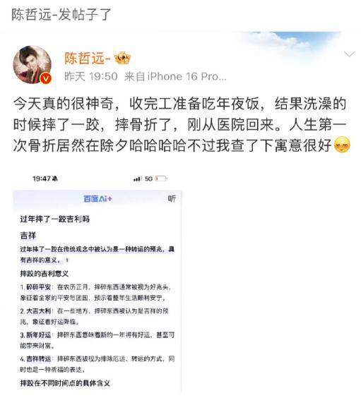 陈哲远的可贵,不仅在于敬业,更在于真诚。从受伤、手术到取钉,他全程通过微博向公众报备,晒出医疗图片,解释“这是我引以为傲的锁骨”,回应粉丝关于手术安全的担忧。这种透明化的危机公关,打破了娱乐圈“遮丑避短”的惯性,建立起一种新型的艺人与粉丝关系——信任,不靠完美人设,而靠真实与担当。他用行动证明:真正的偶像,不是没有伤痕,而是带着伤痕依然前行。