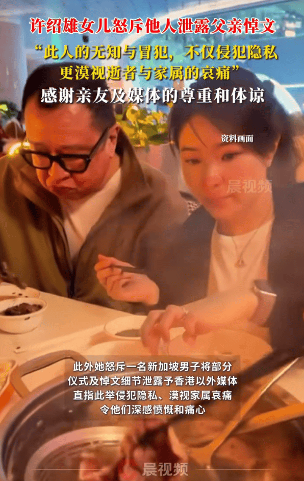 (来源:潇湘晨报)12月6日,许绍雄女儿在社交平台发文称想念父亲,感谢亲友及媒体的尊重和体谅,她表示多数来宾均尊重家属意愿,未拍摄或外传仪式内容,对此深表感激。此外,她怒斥一名新加