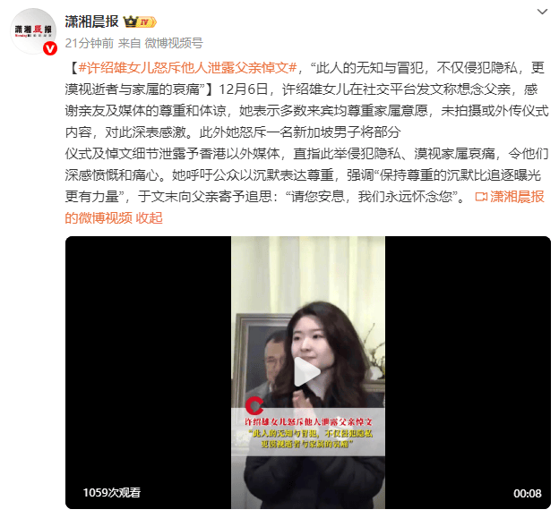 12月6日,许绍雄女儿在社交平台发文称想念父亲,感谢亲友及媒体的尊重和体谅,她表示多数来宾均尊重家属意愿,未拍摄或外传仪式内容,对此深表感激。