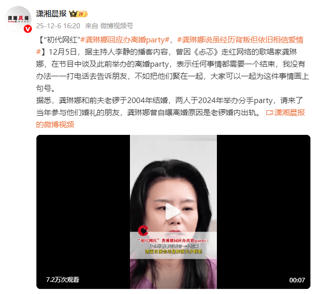 (来源:潇湘晨报)12月5日,据主持人李静的播客内容,曾因《忐忑》走红网络的歌唱家龚琳娜,在节目中谈及此前举办的离婚party,表示任何事情都需要一个结束,我没有办法一一打电话去告诉