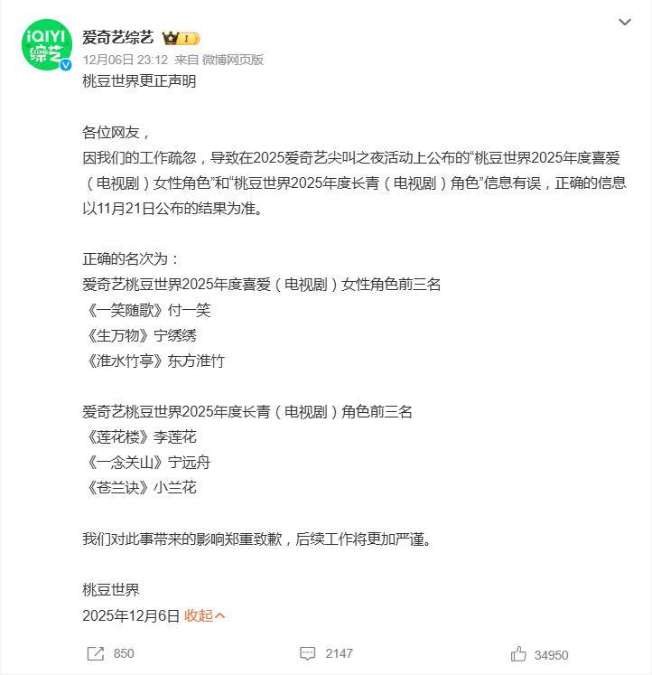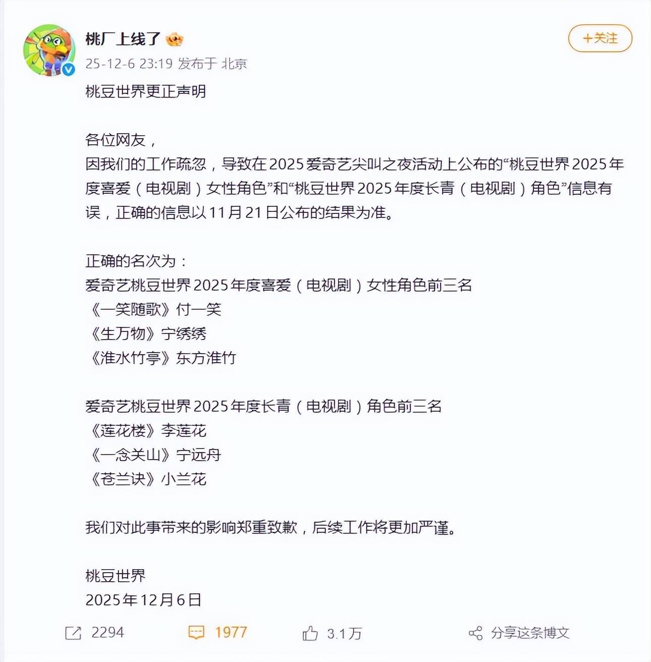事件发酵后,爱奇艺在深夜发布了一份更正声明,承认是“工作疏忽”,并强调以11月21日的结果为准。但这份轻描淡写的道歉,既未向受影响的艺人及网友单独致歉,也未提出任何具体的赔偿或补偿方案,被网友嘲讽为“甩锅式疏忽”、“废话文学”。