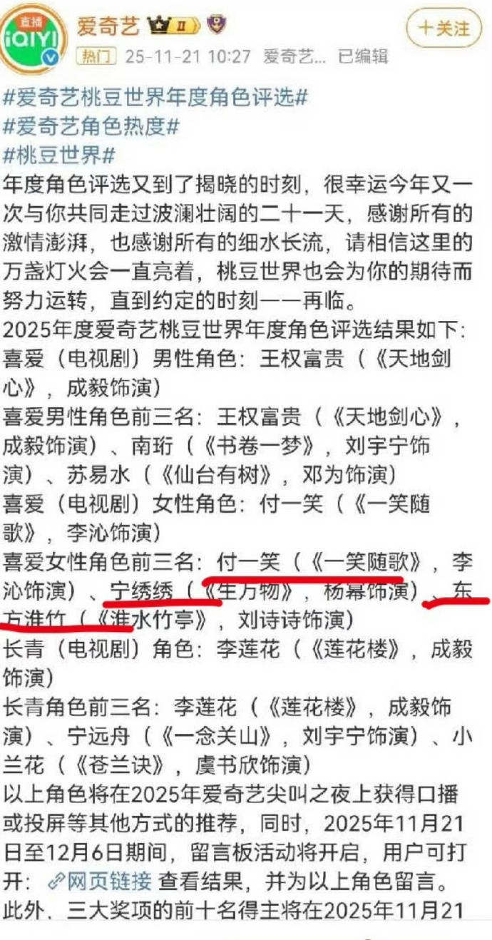 这场风波的核心,在于爱奇艺自己“打脸”自己。早在11月21日,平台就官方公示了投票结果,并白纸黑字承诺前三名将在“尖叫之夜”获得口播或投屏推荐。无数网友为了将演员的角色送上这个曝光位,真金白银地投入进行了一场激烈的“氪金” battle。刘诗诗其角色以“断层领先”的热度值稳居第三。