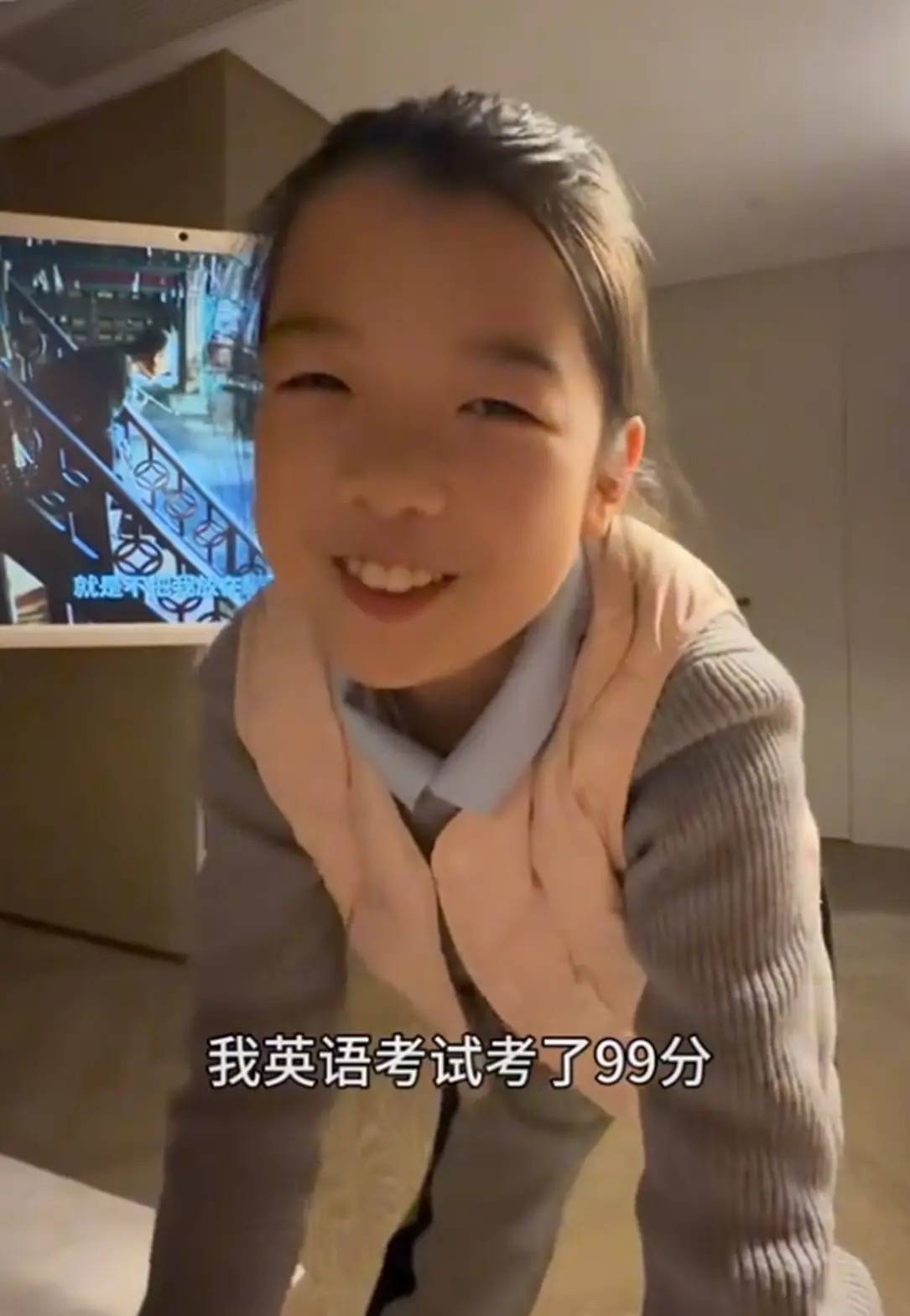 在英语考试中,10岁的女儿王唯伊考了99分,离满分只差一分,而且是全班第一名。女儿和妈妈分享这个好消息,吴雅婷问女儿想要什么礼物。