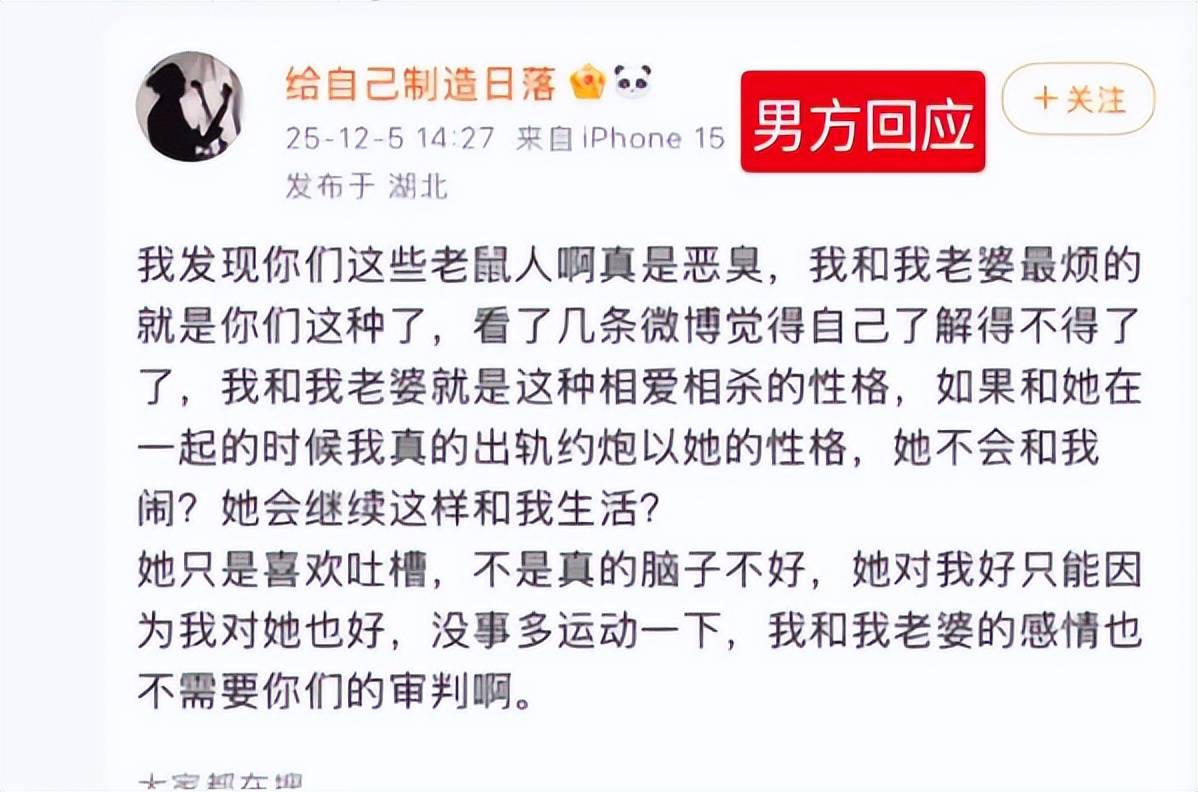 面对舆论海啸,邓先生的回应苍白无力。他否认账号变现,将妻子指控归咎于“孕期情绪波动”,辩称婚姻是“相爱相杀”、“哪有不吵架”。但对其出轨证据始终未作直接回应。12月6日,他宣布停更系列视频。