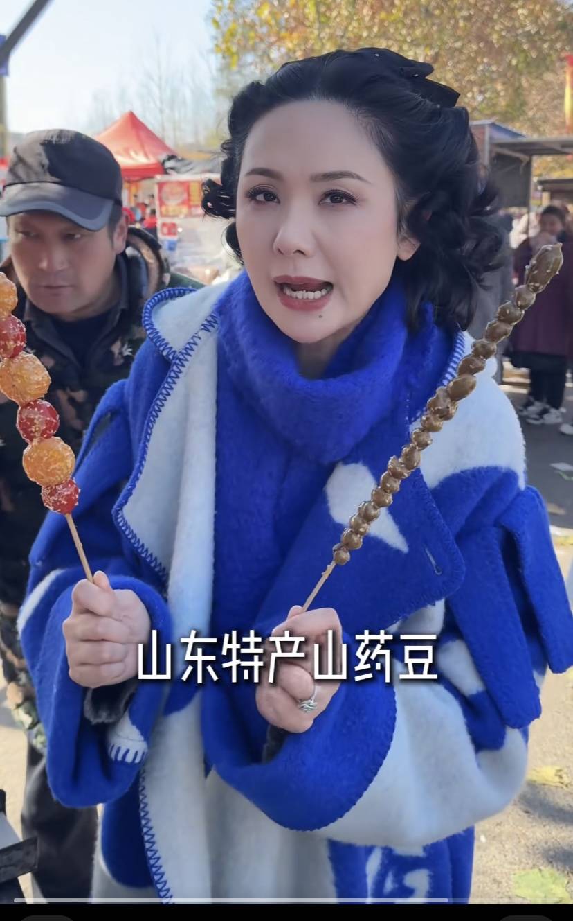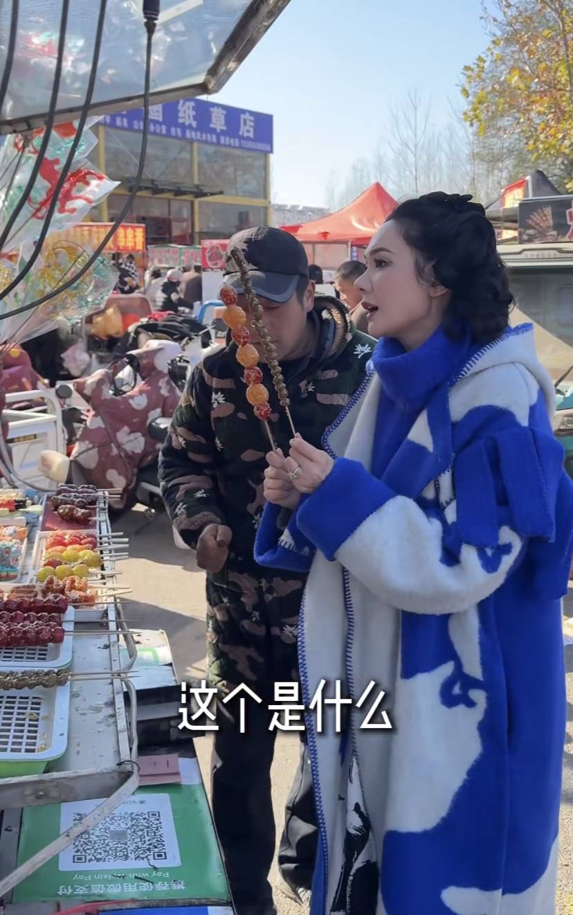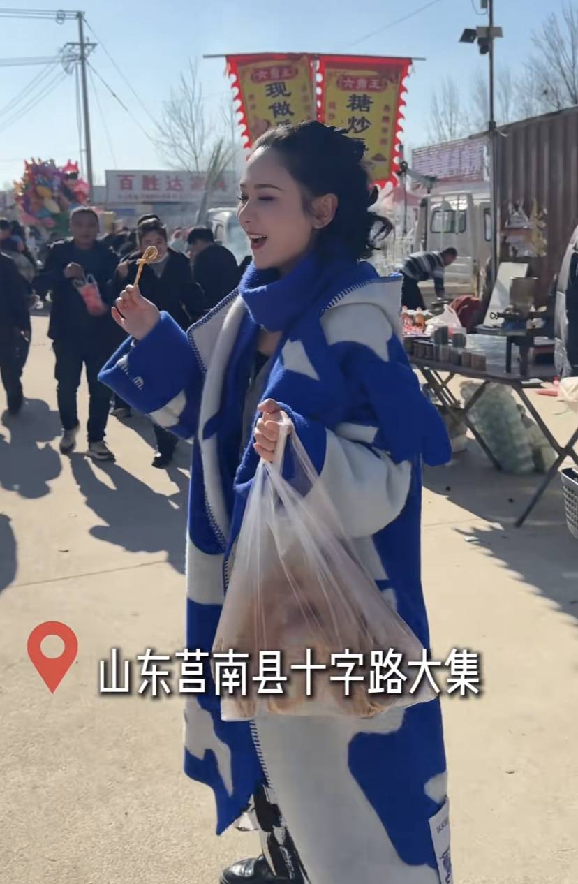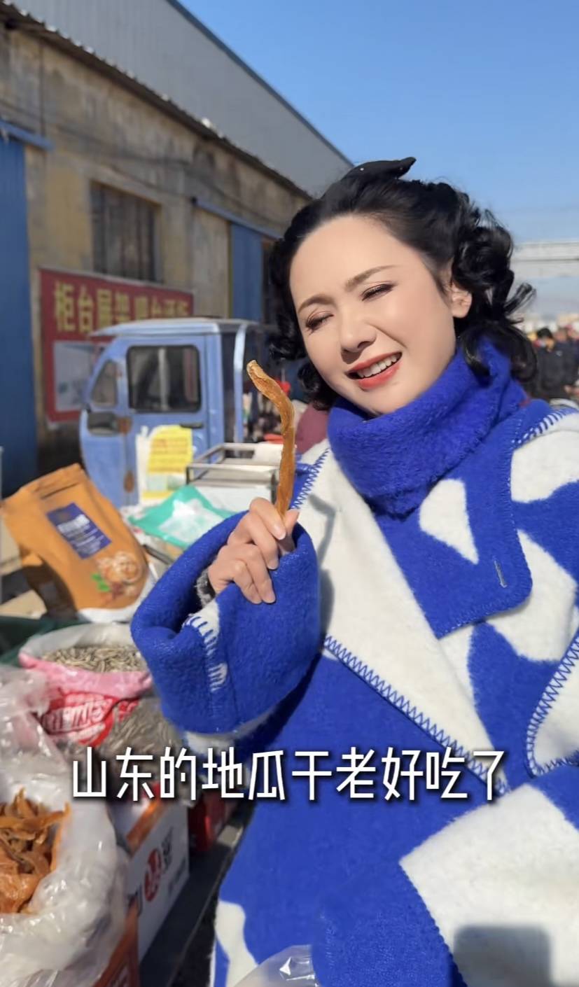 农村大集,真的非常有烟火气。程莉莎走在卖干果的摊贩前,随手拿起地瓜干就尝了一口。她说山东的地瓜干老好吃了,不愧是山东媳妇、对山东的一切都是那么热爱。
